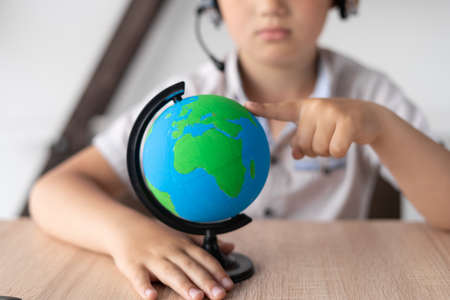 close-up of a schoolboy boy with a globe in his hands. an elementary student sits at a desk and chooses a place to travel. Boring geography lesson remotely. Back to school concept.