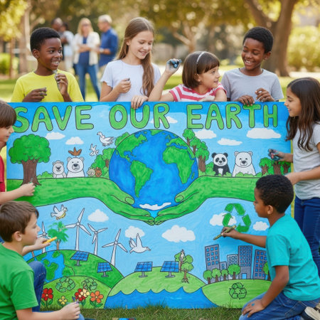 Diverse group of children painting a large Save Our Earth mural depicting the planet, renewable energy, and diverse wildlife, promoting environmental awareness and conservation.