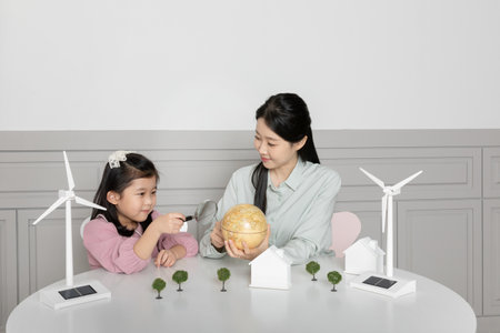 Young teacher with model of wind turbine learning pupils about wind energy.