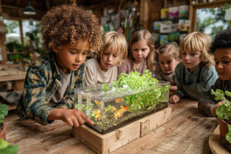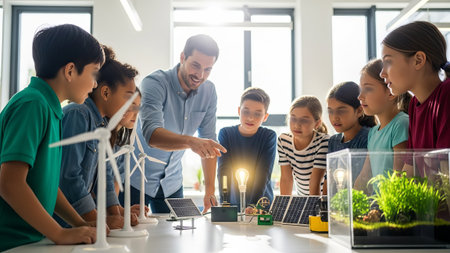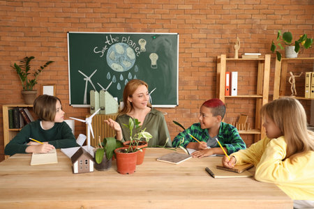 Diverse Students Engaging in Environmental Education in Classroom. Generative AI.