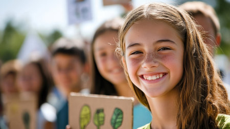 a group of children who participate in action to protect the environment. Girl holding green poster with yellow text Save Planet