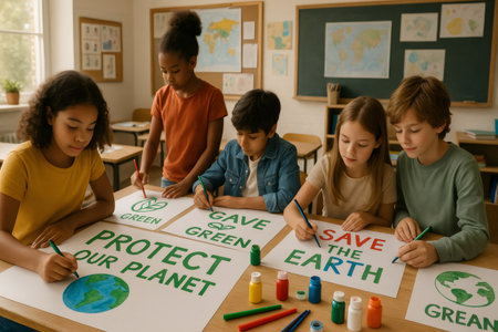 Diverse group of children engaged in making environmental posters, promoting messages to protect the planet, in a classroom setting