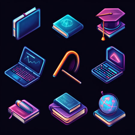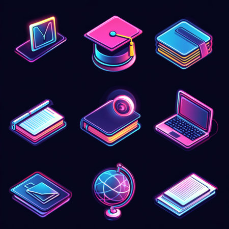 Set of neon icons on the theme of education. Graduation cap, books, laptop, globe, book. Vector illustration