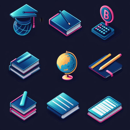 Education icons set in isometric 3d style isolated on dark background