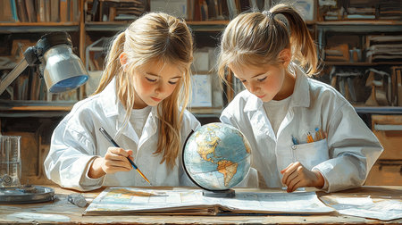 Two curious young students in lab coats observe a globe, emphasizing education and exploration. They are in an academic setting, engaging in hands-on learning activities, showcasing curiosity and teamwork.