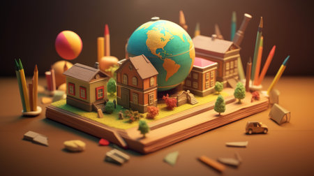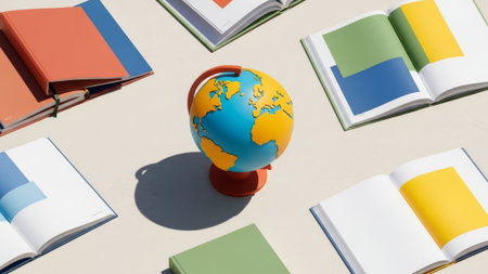 Globe and open books on a bright, neutral background. Education, travel, learning.