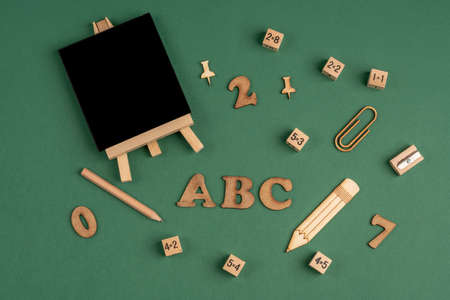 Stationery for school, many different wooden letters lie on a white background. Concept Back to school. Top view, flat lay.