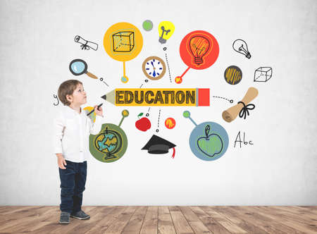 Cute little boy in a white shirt and dark jeans holding a marker and looking upwards. A concrete wall background with an education sketch on it.