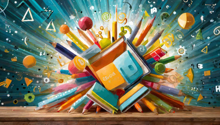 This dynamic back-to-school background showcases a vivid explosion of colorful geometric shapes and academic symbols, ideal for enhancing educational projects, presentations, or classroom