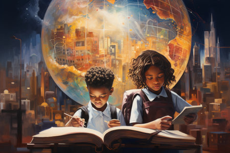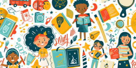 A colorful, seamless pattern featuring happy children engaged in various educational and playful activities.