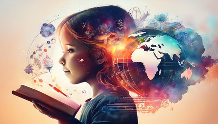Cute girl with opened book and Earth planet. Elements of this image are furnished by NASA