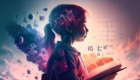 Schoolgirl with opened book and science formula on background. mixed media