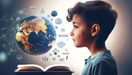 Side view of little boy holding opened book and looking at Earth planet. education concept
