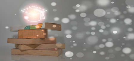 glow in the dark graphics of the graduation cap Floating on piles of old books, in the dark, education is a light of hope in the dark. with bokeh