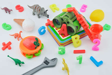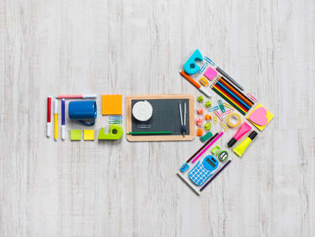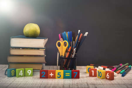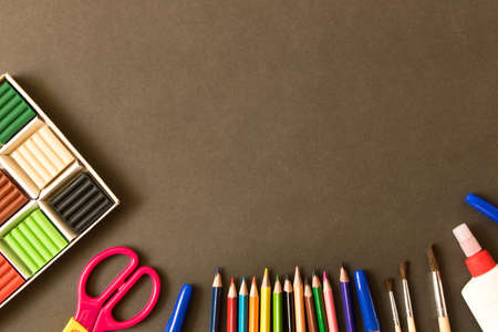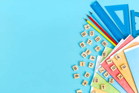 School supplies and stationery.Back to school concept. Frame with various colored stationery. copy space.Teaching children primary school.stationery for the study of mathematics and the alphabet