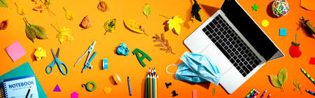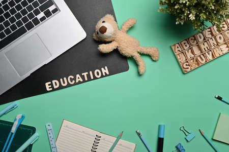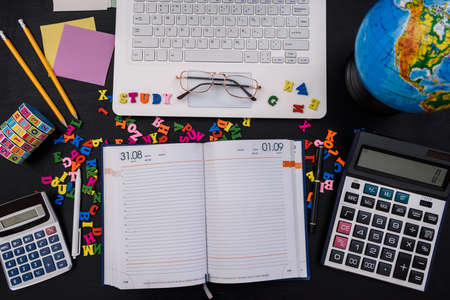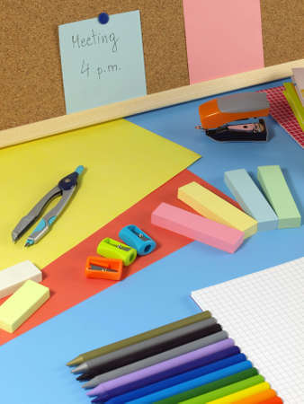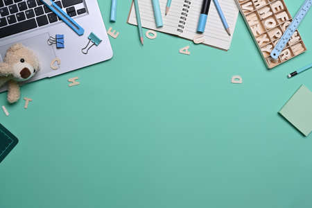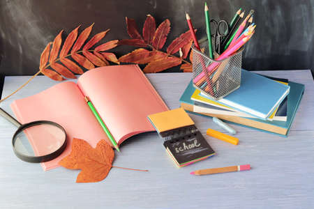 School stationery on desk, home learning concept, part of kids room interior, back to school