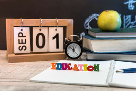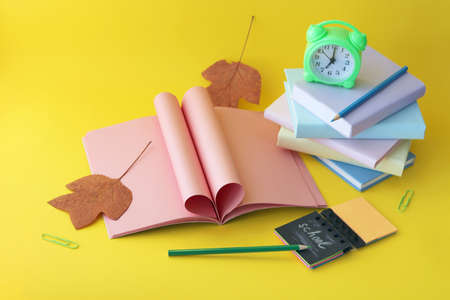 Back to school, alarm clock, open blank notebook, stack of books and pencils on bright background, learning concept, homework