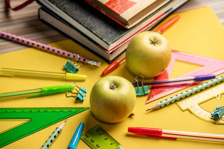 Apple, book and colorful school stationery items on a yellow background. Back to school concept