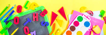 Back To School Concept. Various school stationery and supplies - chalk, color pencil, paints, notebooks, brushes, tablet, small blackboard. Flatlay top view copy space on yellow bright background.