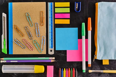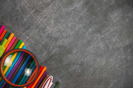 multicolored school supplies lie on black chalkboard, short focus, partial blur