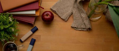 Top view of autumn workspace with copy space, stationery, notebooks, sweater and decorations on wooden table