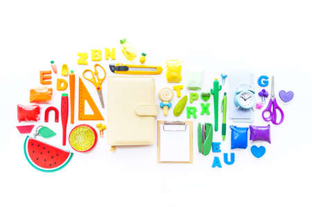 Stationery rainbow a lot flat lay White background. Back to school. Kawaii office supplies