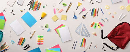 Assortment of school supplies with very varied material on white table. Top view. Panoramic composition.