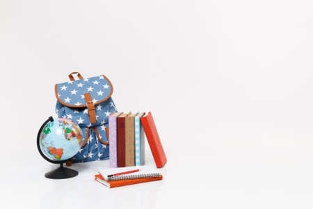 World globe, blue backpack with stars print and colorful school books isolated on white background. Accessories, supplies for students. Education in high school university college concept. Workspace