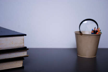 Concept of school, stationery for school use is placed on a desk with a checked sheet, in the foreground a stack of books, in the background a technical drawing bracket.