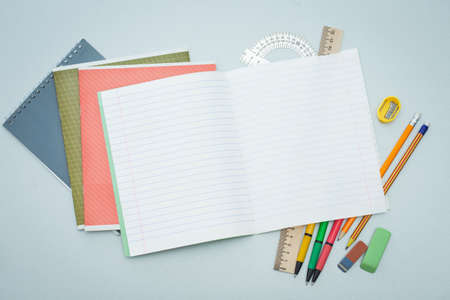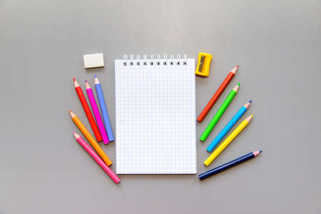 white blank opened notebook and school supplies on a gray background. White sheet of paper, colored pencils, felt-tip pens, eraser, sharpener. Back to school