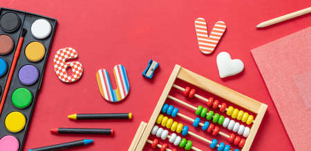 School supplies flat lay. Stationery on red color background, top view. Education, Back to School, kids creativity concept