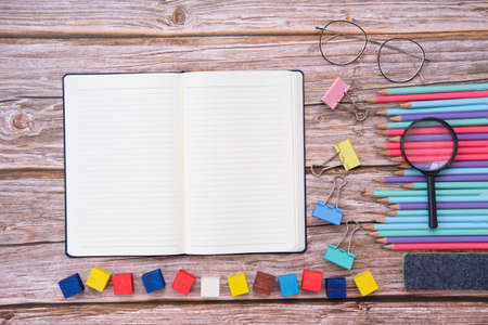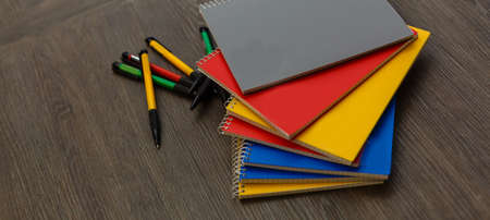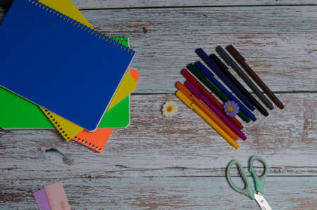 Back to school supplies, notebooks, colored pencils from above. Flat lay. Top view