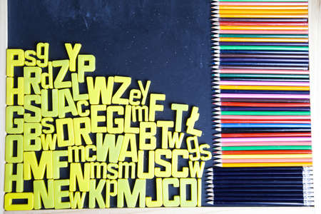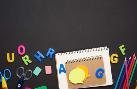 Black blackboard background with coloful letters of the english alphabet. Flat lay supplies with copy space. Back to school concept. ... High quality photo