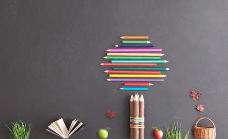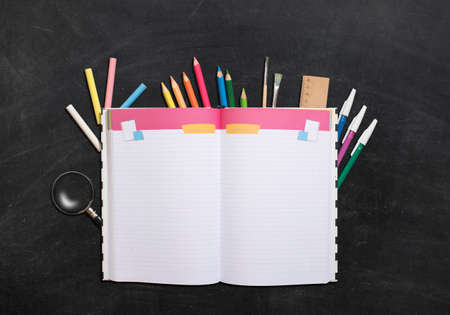 colorful wooden pencils, notebook on a blank black chalk board, school stationery, copy space, back to school
