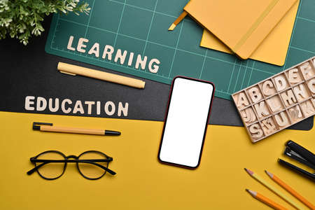Mock up smart pone with white screen, glasses and stationery on colorful background.