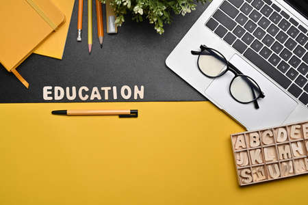 Above view laptop computer, glasses and stationery on yellow background. Back to school concept.