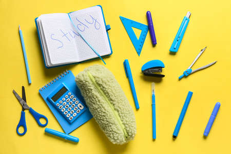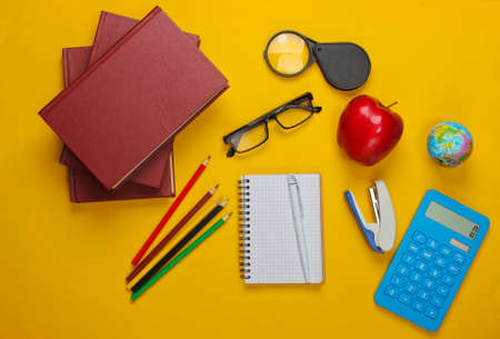 School supplies on a yellow background. Back to school. Flat lay education composition. Top view