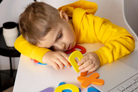 Little boy learning alphabet and numbers online, with laptop at home. Child is sad and tired. Negative emotions, stress, mental problems. Homeschooling and distance education for kids.