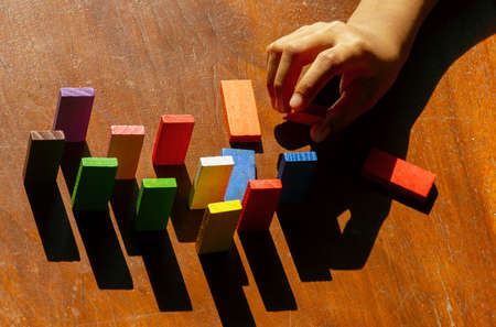 The hands of a child playing a board game, builds a tower from wooden blocks.