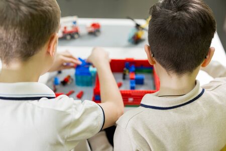 Children play in the designer at the table. Two boys play together with colored plastic blocks in the gaming center, school