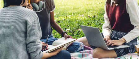 Group of smiling international students or teenagers sitting and using laptop computer doing their homework with book together in park at university.Education and friendship Concept