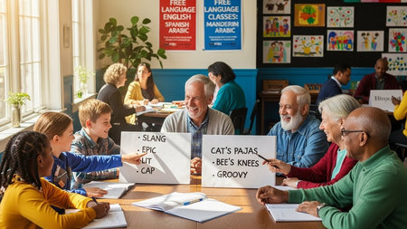 A diverse group of people, including children and seniors, are engaged in a language learning session, exploring new slang terms and having a good time together.