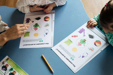 Side view of private tutor teaching her student with blank paper, stationery and digital tablet on wooden desk