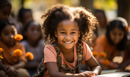 Smiling young girl in a classroom setting, looking confidently at the camera with classmates in blurred background.