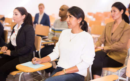 Business training. A group of people takes notes on a lecture.