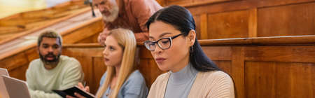 Asian student sitting near interracial friends and teacher in university, banner