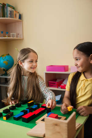 happy interracial girls looking at each other while playing with wooden blocks in montessori school