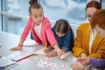 Learning the foreign alphabet. Children doing the assignment with letters together with the teacher