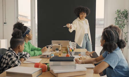 Classroom with diverse learners of happily African American students and teacher doing activities together. The teacher is teaching, guiding and talking to the children in diverse.