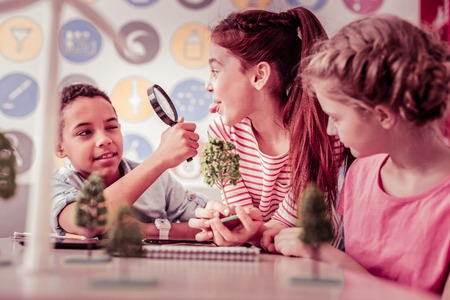 Carrying magnifying glass. Ginger mischievous girl showing tongue to her classmate while he playing with magnifying glass